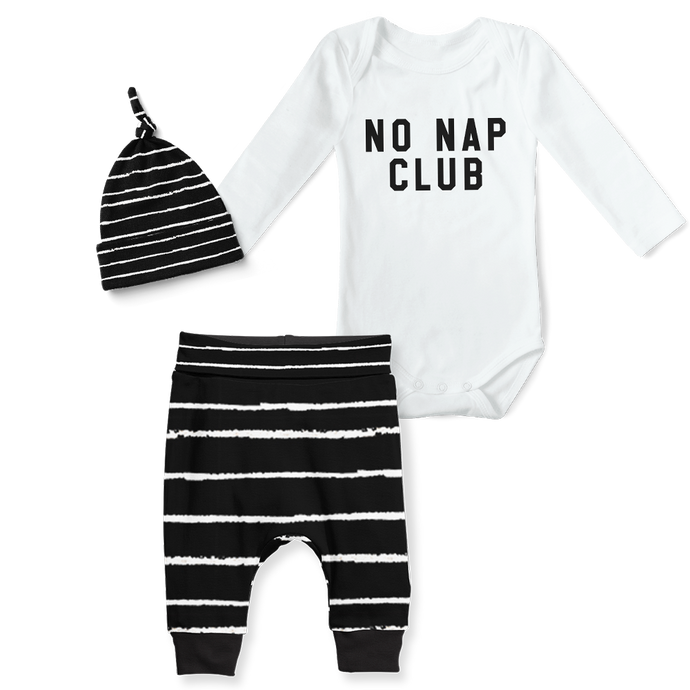 3-Piece Jogger/Onesie/Beanie Set - No nap club/Stripe Black
